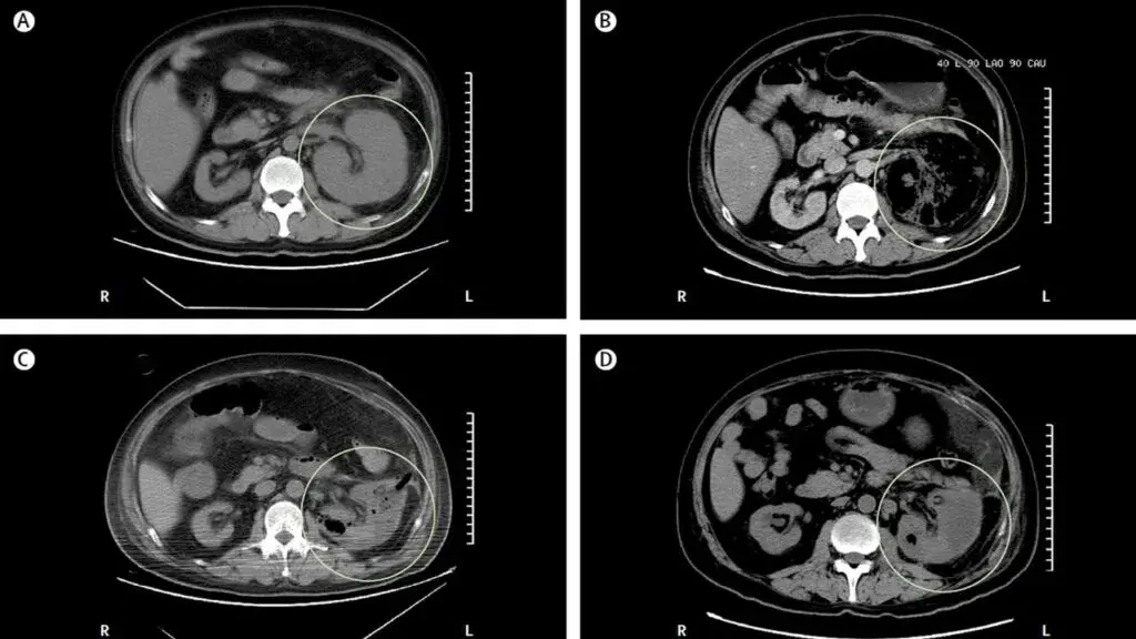 Caso típico de **pielonefrite enfisematosa** publicado no The Lancet ([link](https://www.thelancet.com/journals/lancet/article/PIIS0140-6736(19)30771-8/fulltext)). Os casos geralmente são decorrentes de infecção por _Escherichia coli_ em pacientes com diabetes descompensado e obstrução do trato urinário. A glicose é um substrato para proliferação de bactérias fermentadoras (_Enterobacteriaceae_), que produzem gás carbônico e hidrogênio. **Fica a dica do elevado risco de embolização**. Quando presente obstrução, a desobstrução da via urinária é mandatória. Nos casos com gás no parênquima ou espaço perirrenal, é sugerido fortemente drenagem percutânea, caso o gás fique limitado ao espaço coletor (pielite isolada) o manejo com antibióticos é suficiente.